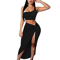BEAGIMEG Women’s Sexy One Shoulder Long Bodycon Slit Skirt 2 Pieces Dress