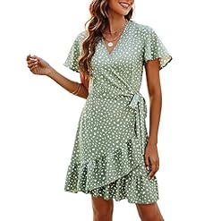 Naggoo Women’s Summer Wrap V Neck Polka Dot Print Ruffle Short Sleeve Mini Floral Dress with Belt