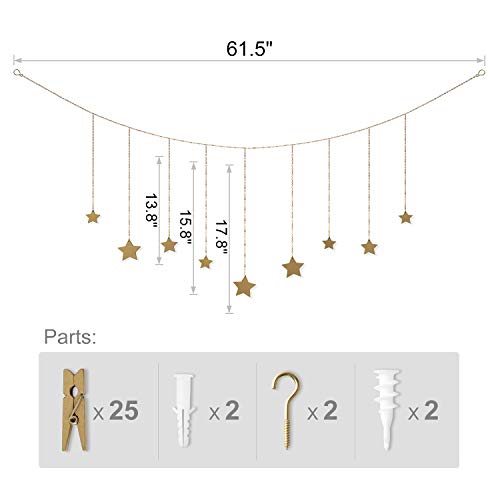 Display your important moment: Wood stars hanging garland with chain a casual, artistic way to show your favorite photos and prints. It makes a lovely addition to hanging on walls, shelves, bedpost, mirrors, fireplace, window and more.